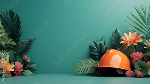 A green background featuring a orange hard hat, symbolizing planning and safety first concepts in construction and workplace environments.