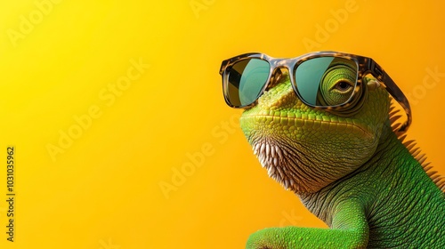 A green chameleon with sunglasses looking to the left against a yellow background.