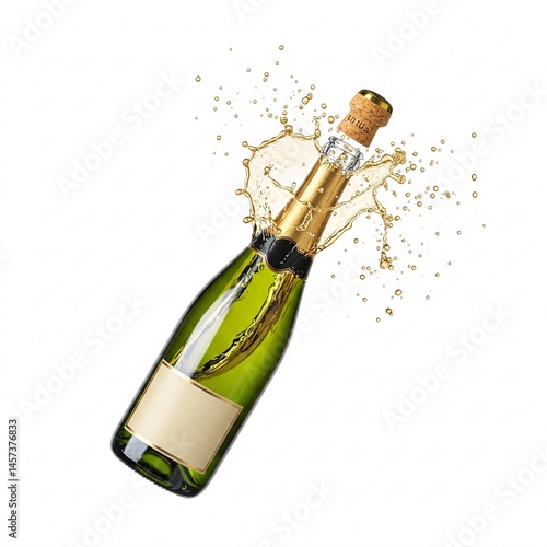 champaign, bottle, splash, green, gold, isolated, white background, alcohol, drink, beverage, celebration, party, new year, christmas, festive, nobody, still life, studio, liquid, sparkling, open, excitement, moment, vertical, clear, glasses, cork