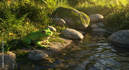 A green frog sits peacefully beside a flowing stream in a lush environment.