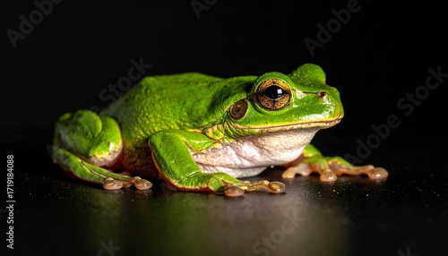 A green frog—orange feet, yellow belly, eyes wide—rests in luminous stillness. A metaphor for vivid alertness and the choreography of amphibian poise.