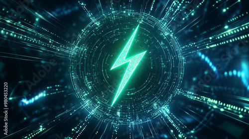 A green lightning bolt icon surrounded by glowing lines on a black background, in a futuristic technology style