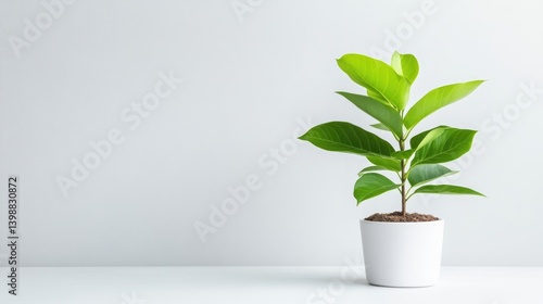 A green potted plant thriving on a white surface against a minimalistic light grey wall, and showcasing simplicity and natural beauty indoors.