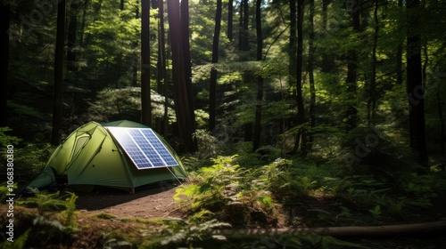 tent, green, forest, solar panel, environmentally friendly, adventure, nature, sunlight, tree, camping, harmony, sustainability, foliage, explorer, serenity, canopy, environment, energy, innovation, travel, outdoors, conservation, lush, calmness, escape, renewable, relaxation, retreat, safety, peacefulness, fresh air, backpacking, wood, simplicity, technology, power, balance, connection, exploration, solitude, resilience, journey, shelter, wilderness, scenic, recreation, greenery