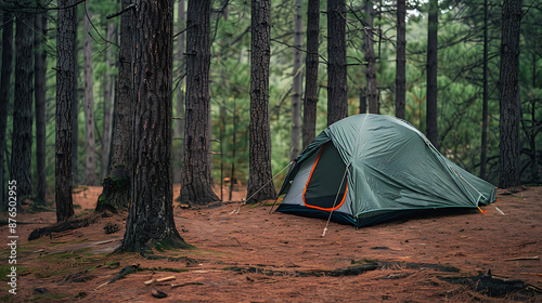 a green tent with orange detailing, set up in a forested area. Tall trees surround the tent, and the ground is covered with pine needles and other forest debris