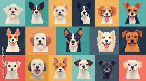 A grid of flat design icons featuring dogs in various poses and sizes, arranged side by side on colorful squares.