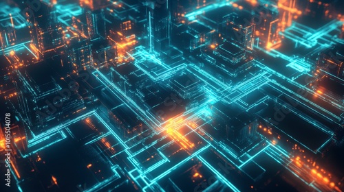 A grid of glowing cyan lines with light particles, resembling a futuristic cityscape from a top-down view.