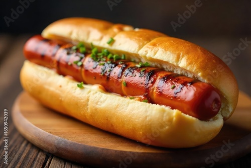 A grilled hot dog nestled inside a toasted, buttery bun, creating a classic sandwich-style hot dog Perfect for a quick and satisfying meal , relish, street food