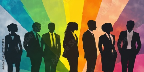A group of business people in silhouette with various color backgrounds, including rainbow and gray tones Generative AI