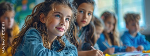 A group of children are sitting at a table with pencils and paper. One girl is smiling and looking at the camera. Scene is happy and playful, as the children are engaged in an activity together