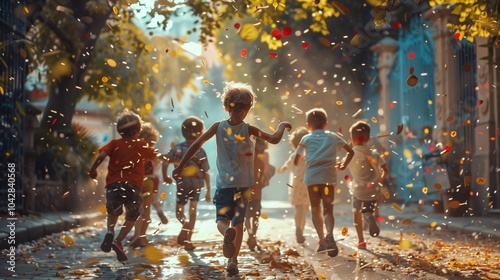 A group of children runs excitedly down a street with colorful leaves falling around them