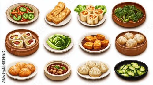 A group of Chinese vegetarian food icons including tofu dishes, stir-fried greens, and vegetable dumplings, isolated on white