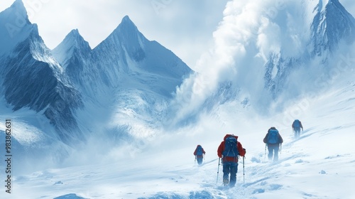 A group of climbers hiking through a snowy pass, with towering ice-covered peaks in the background and their breath visible in the cold air.