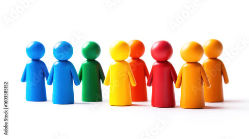 row, wooden, figure, group, colourful, wood, colours, white, background, standing