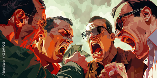 A group of criminals arguing over a split of money, their faces contorted with anger and greed.