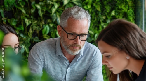 A group of environmental consultants brainstorming solutions for reducing carbon emissions in a modern eco-friendly office