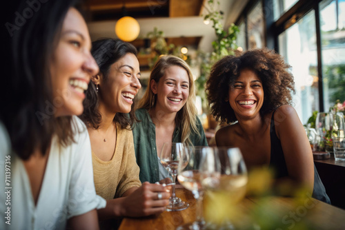 A group of female friends hanging out in a cafe, or a restaurant, talking and laughing, enjoying their time together.