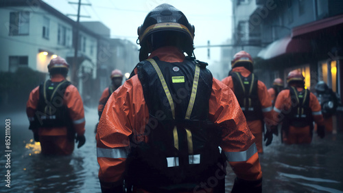 A group of firefighters advance along a suburban road submerged in floodwaters during twilight, equipped with safety gear and helmets - Generative AI