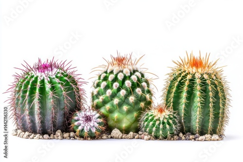A group of five cacti of different sizes and species arranged on a white background with small rocks