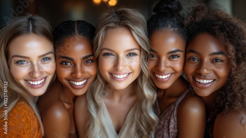 A group of five diverse multicultural happy women smiling together, representing friendship, unity, diversity in DEI using inclusivity to build human connections