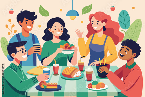A group of five friends happily shares a meal, smiling and interacting while surrounded by delicious food and a warm, inviting atmosphere.