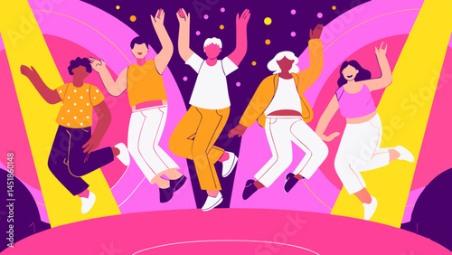 people, jumping, stage, spotlight, joyful, celebration, party, event, dance, music, performance, entertainment, fun, happy, excitement, energy, youth, friends, togetherness, community, illustration, graphic, design, cartoon, artwork, colourful, pink, purple, yellow, white, orange, black, fashion, style, modern, contemporary, background, abstract, shape, pattern, light, audience, crowd, cheering, movement, dynamic, celebratory