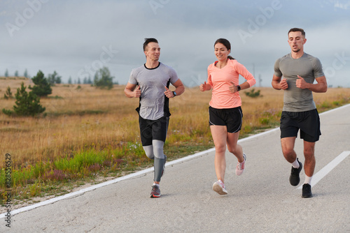 A group of friends, athletes, and joggers embrace the early morning hours as they run through the misty dawn, energized by the rising sun and surrounded by the tranquil beauty of nature