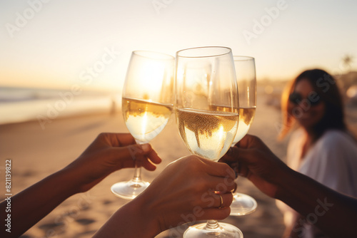 a group of friends caucasian an African American hands toasting champagne glasses for valentine with a beach background, a celebration or engagement concept