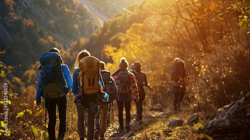 a group of friends hiking in the mountains, shot from behind, sunny day