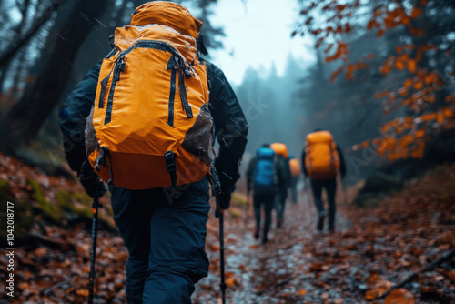 A group of hikers, equipped with backpacks, trek through a picturesque autumn forest, leaves changing color, creating a serene and adventurous outdoor experience.