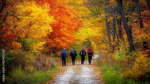 A group of hikers walking along a trail surrounded by colorful autumn trees.