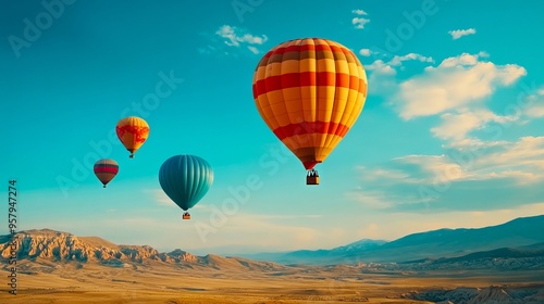 group, hot, air, balloon, flying, over, desert, landscape, float, mountain, plain, sky, sport, ball, 4, huge, background, blue, few, white, cloud, scattered, across, different, colours, 1, orange, yellow, 2, red, largest, center, large, striped, while, smaller, pattern, below, barren, vegetation, visible, distance, range, foreground, mood, peaceful, serene