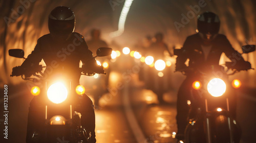 A group of motorcyclists ride through a tunnel, their headlights illuminating the dark road ahead.