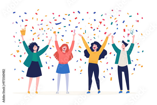 A group of office workers celebrating a successful project with confetti and cheers in a flat art style. The minimalistic design highlights teamwork and achievement