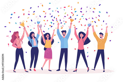 A group of office workers celebrating a successful project with confetti and cheers in a flat art style. The minimalistic design highlights teamwork and achievement
