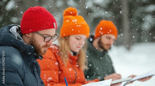 A group of people bundled up in warm winter clothing gathered together in a peaceful snowy outdoor setting collaboratively writing and sharing winter themed haikus as a literary and engaging pastime