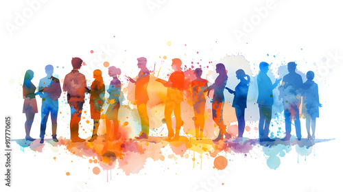 A Group of People Discussing Watercolor Business Solutions with Laptops on Whimsical Background
