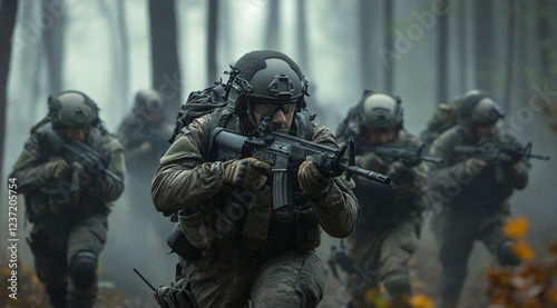 soldier, camouflage, gear, helmet, rifle, walking, misty, forest, atmospheric, dense, tree, fog, tension, mystery, military, patrol, wood, tactical, operation, armed, combat, uniform, foliage, greenery, environment, nature, forested, timberland, squad, team, formation, mission, strategy, stealth, readiness, terrain, landscape, expedition, operated, exercise, training, preparedness, equipment, protection, defense, security, warfare, infantry, unit
