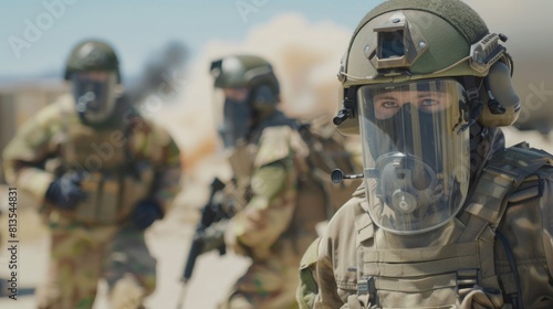 A group of soldiers wearing protective gear. Suitable for military or security concept