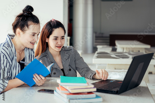 A group of teenage student in university smiling and using the laptop to learning the reason and doing the homework in summer holiday.