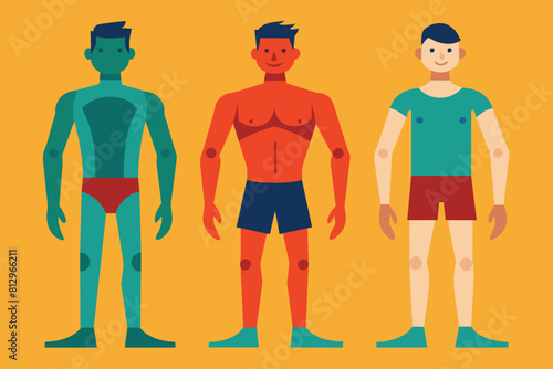 A group of three men standing side by side in a customizable flat illustration, Types of male body shapes Customizable Flat Illustration