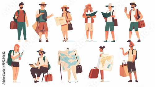 A group of tourists traveling with a backpack and map, on vacation. A collection of portraits of travelers.