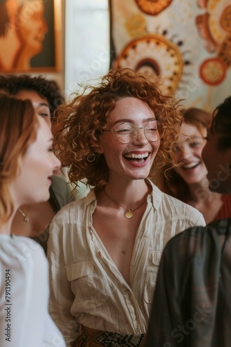 A group of women laughing together in a room with one woman wearing glasses. Generative AI.