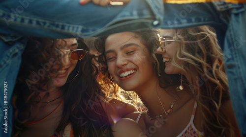 laughing, having fun, carefree, joy, friendship, candid, sunlit, young, together, smile, summer, happy, outdoors, closeup, relaxation, cheerful, youthful, goodtime, hanging out, natural light, playful, leisure, bonding, fun, friends, sunshine, lifestyle, spontaneous, relaxed, happiness, sunset, embracing, bohemian, sun ray, sunglasses, denim, warm light, casual attire, camaraderie