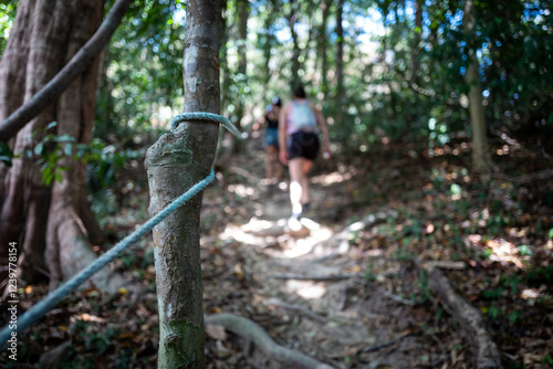 A guiding rope assists hikers on a scenic forest trail, sunlight dappling through the lush canopy.