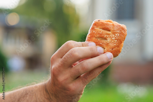 A guy's hand holds a mini puff pastry with cheese, snack and fast food concept. Selective focus on hands