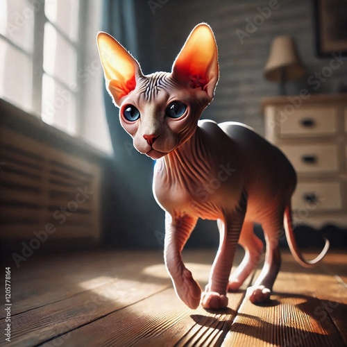 A hairless Sphynx cat walks against a light background, showing off his wrinkled skin and prominent ears. The cat's large, curious eyes and unique appearance stand out.