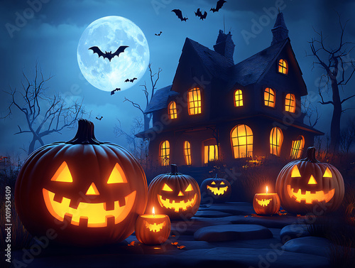 a Halloween scene with a lit jack-o'-lantern in front of a spooky house, surrounded by smaller pumpkins with candles.