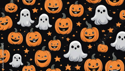 A Halloween seamless pattern featuring smiling pumpkins, cute ghosts, and orange stars on a whimsical background, perfect for festive designs and seasonal decor.