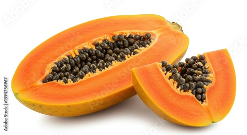 A halved papaya and a slice on a white background showing the seeds and the orange flesh inside fruit isolated on white background